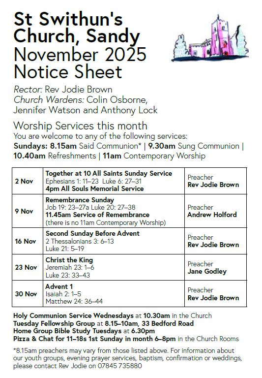 11.15am – Parade proceeds at along Bedford Road. Deputy Lieutenant of Bedfordshire, The Mayor of Sandy, and The Chairman and President of RBL Sandy Branch will take the salute at Fayne’s Corner, then continue along the High Street.